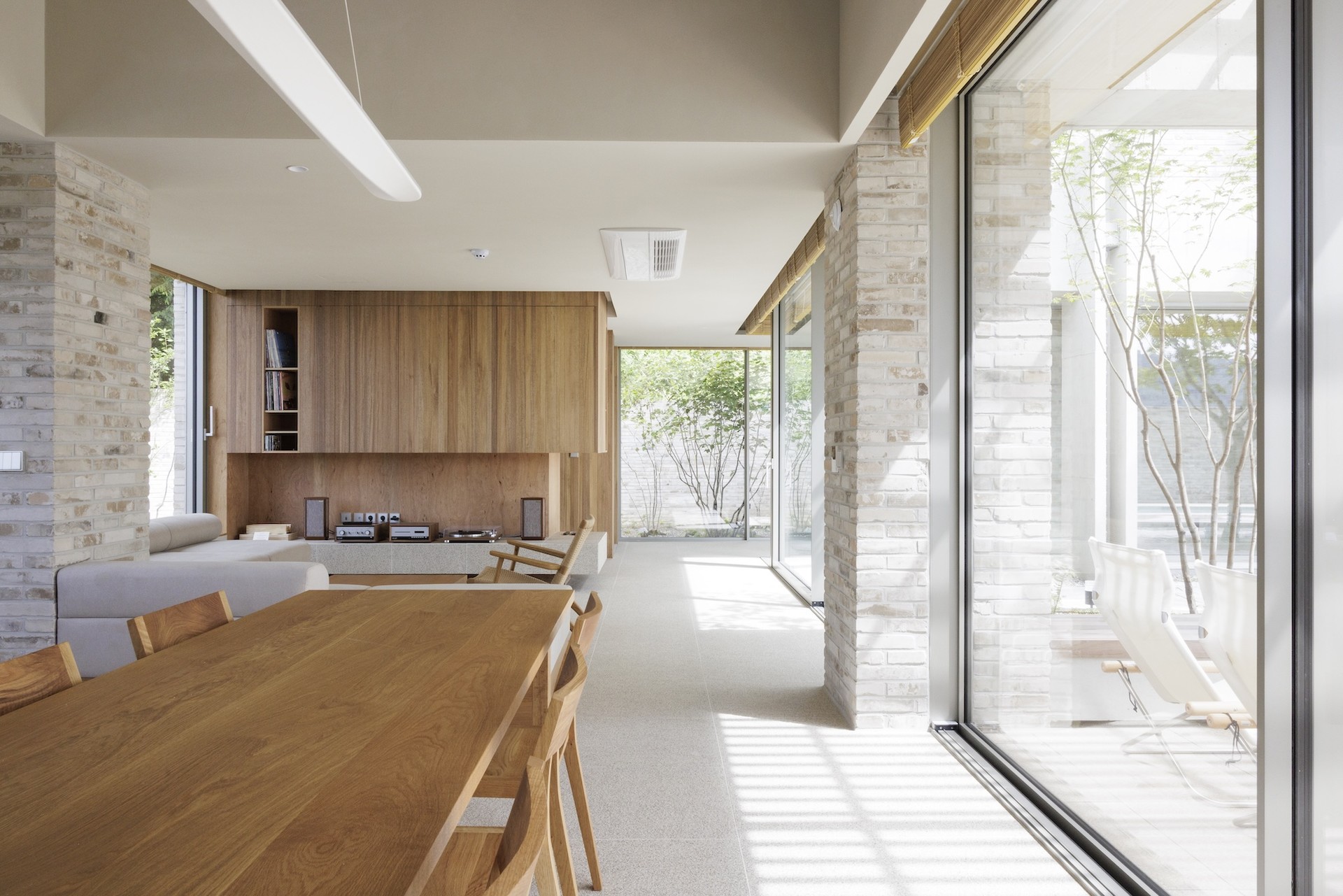 The architectural starting point was not the interior but the brick wall itself. Its rhythm and shifting tones respond subtly to the seasons and the light, binding the entire house into a single, continuous flow. The wall becomes an experiential axis that guides visitors from outside to inside, gently introducing the river breeze and the shadows of the birch trees. More than a structural element, it was intended to serve as a medium that conveys the emotional atmosphere of the place.